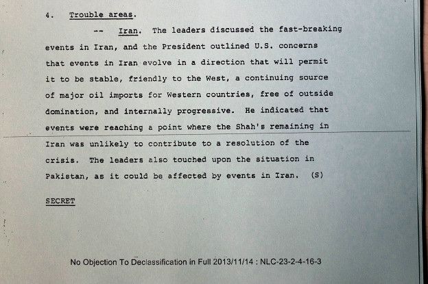 به تازگی سندی محرمانه از گفتوگوهای گوادلوپ منتشر شده که نشان میدهد بحران ایران در حاشیه این نشست مطرح بوده است. به علاوه، کارتر پیش از دیدار با همتایان اروپاییاش، در جلسه غیررسمی شورای امنیت ملی آمریکا در واشنگتن، به این نتیجه رسیده بود که شاه به آخر خط رسیده است.